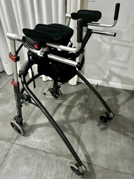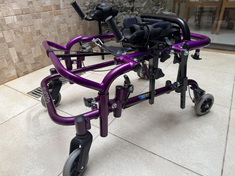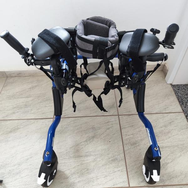 - melhora do equilíbrio postural e estabilidade pélvica, pois vem com cinto e estabilizador de quadril