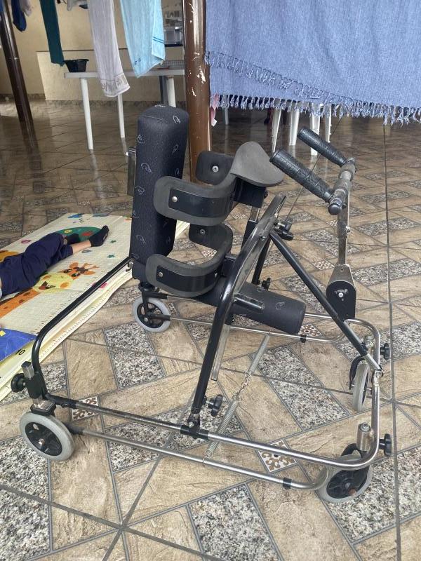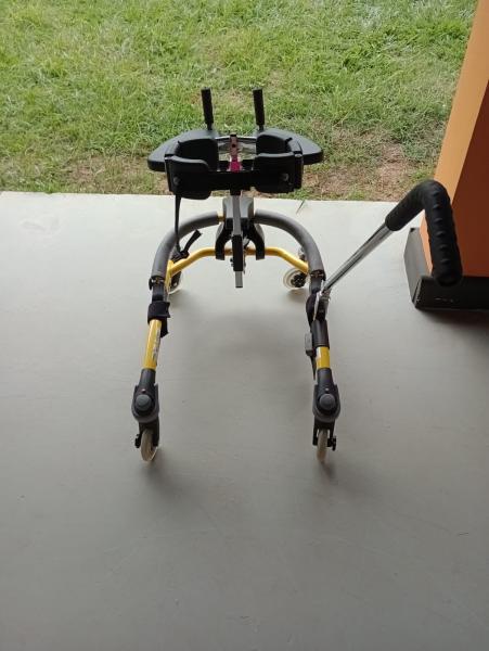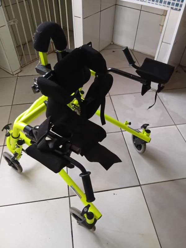 Andador Modelo posterior (usuário puxa o andador); Estrutura em alumínio com pintura eletrostática com uma camada de verniz. Estrutura dobravel e com regulagem de altura; 4 rodas aro 7 emborrachadas, sendo 2 giratórias; Rodas com rolamentos blindados; Controle de esforço nas rodas não giratórias através de manípulos tipo borboleta; Controle de direcionamento nas rodas giratórias através de manípulos; Freio antirecuo nas rodas traseiras, sistema que não permite que se mova para trás. *Cinto tronco almofadado para estabilização com regulagem na altura e profundidade; * Braço calha com apoio de mão acoplado e com regulagem na profundidade e no seu ângulo; * Selim (assento estofado) com regulagem de altura e profundidade; * Apoio lombar almofadado, com regulagem na altura e profundidade acoplado com suportes laterais de quadril também almofadadas, com regulagem na largura;